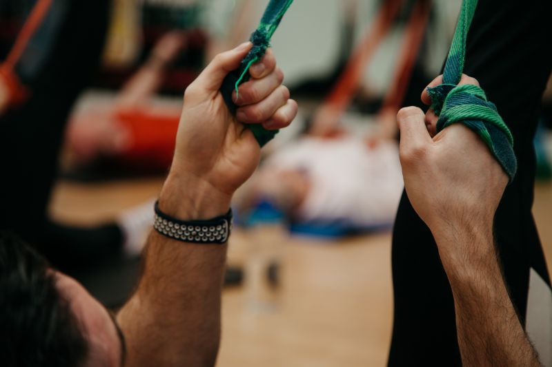 Do as many as you can and then switch positions. -Chest PressFor this exercise, Partner 1 loops the band around their body and holds the band in front of their body with 2 hands. Partner 2 then anchors the band by standing behind Partner 1 and creating tension in the band. Partner 1 will raise the band by keeping elbows bent at 90 degrees with their elbows, biceps and forearms parallel to the ground. Partner 1 can steady themselves by stepping into a slight lunge. Keeping their core engaged, Partner 1 will push forward to fully extend their arms and return slowly to the starting position.