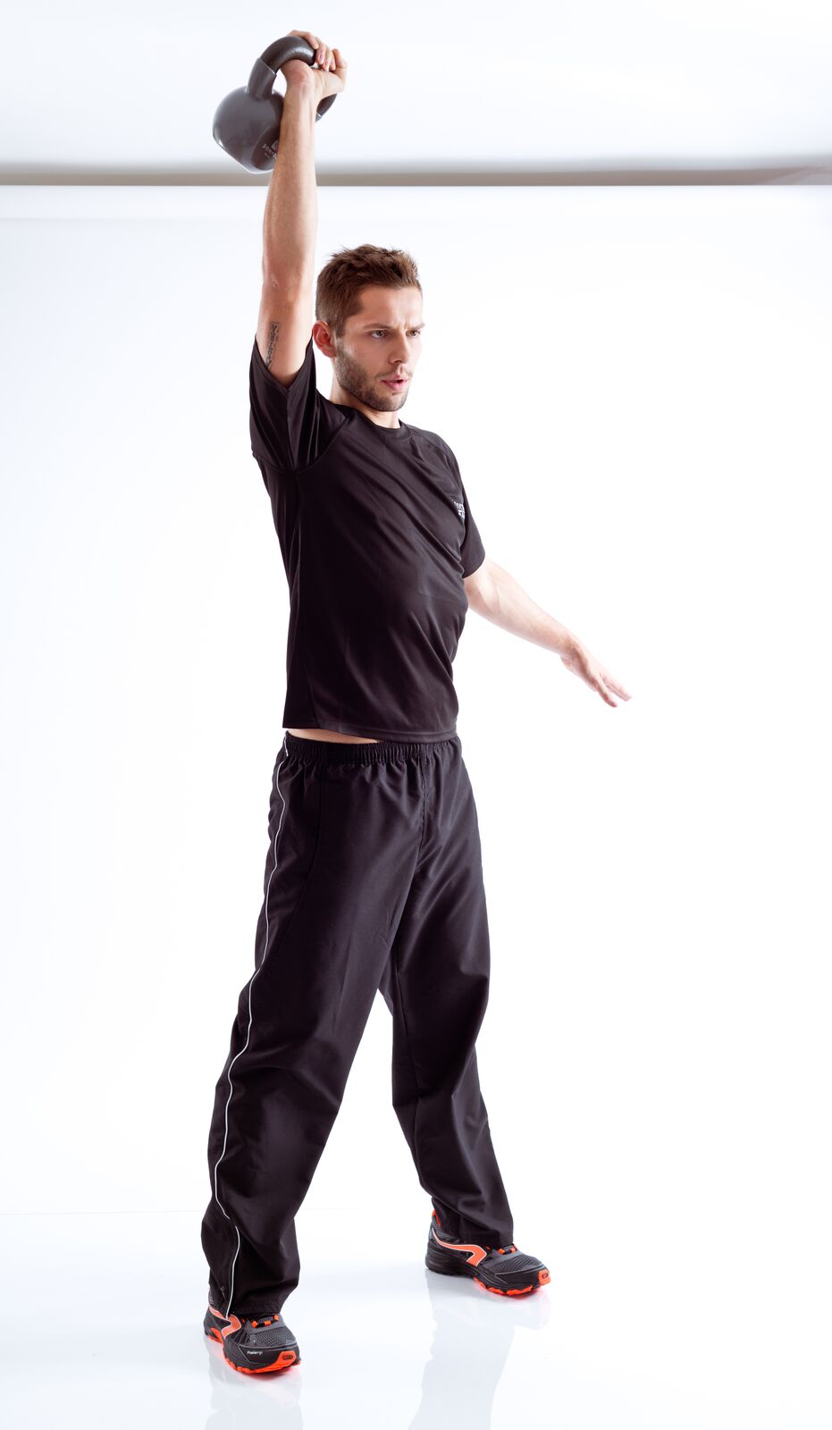 Push press with kettlebells - keep stomach tight and lifted, remember your breath, make slow and controlled movements.