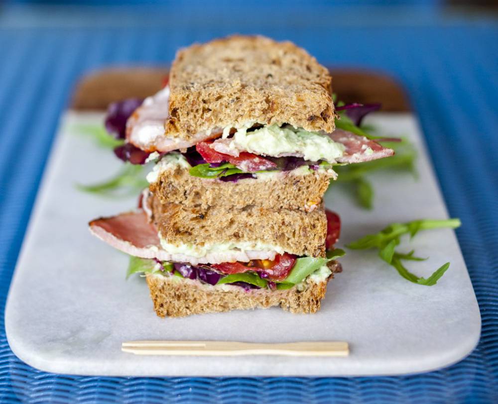 - Spread the bread with the avocado mixture then top one piece with the tomatoes, leaves, herbs and lastly the bacon, finish with your second slice of bread.