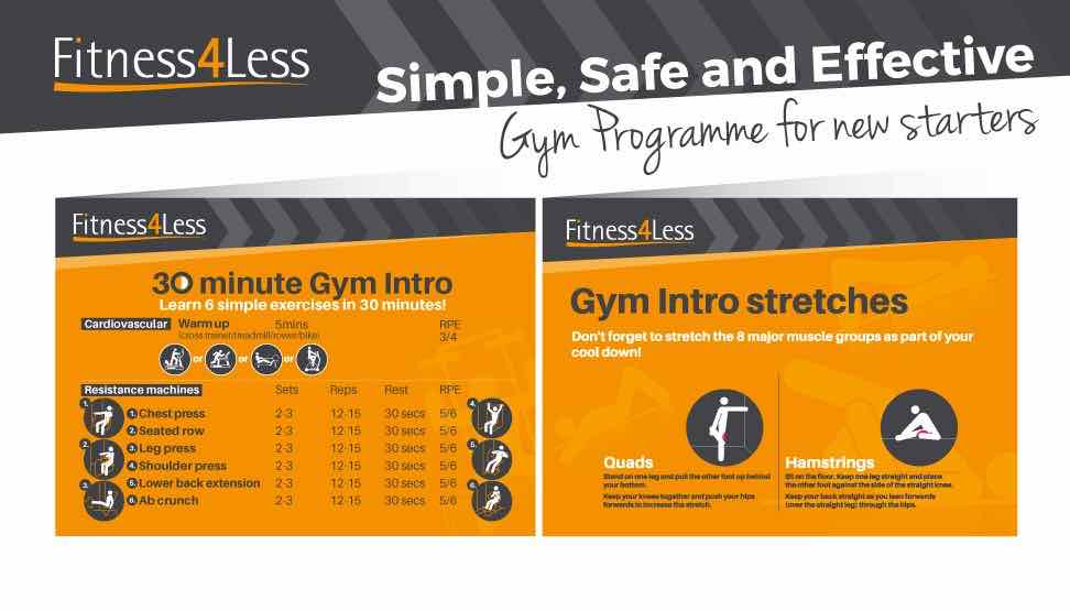 http://www.fitness4less.co.uk/classes/ select your club and filter ’Gym Intros’. These sessions will all show up on the timetable, so you can choose the one that is most convenient for you. Pick up handy Gym Intro Cards at our reception desks or within the gym. They’re hard to miss - being bright orange - and will help remind you of the simple routine, give pointers on technique and offers some progression to work towards.