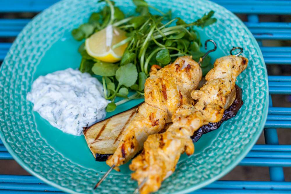 - Grill or barbecue the chicken skewers for 10-12 minutes until cooked through, then serve with big spoonfuls of raita and lots of peppery watercress. Grilled vegetables, cous cous and rice salad are all good accompaniments.