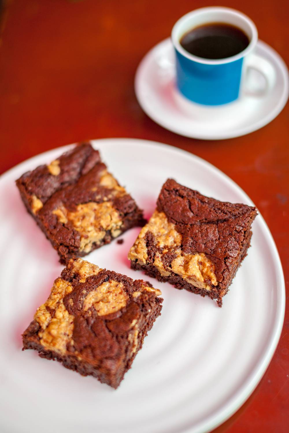 Randomly spoon in the peanut butter. Let it sit for a moment as the heat will soften the peanut butter, then use a knife to swirl it through the brownie mix.