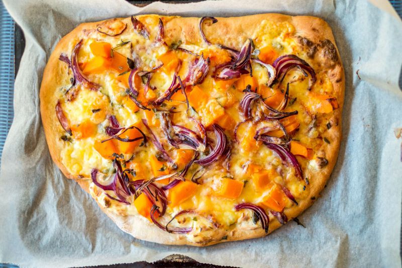 * Scatter with the butternut squash, sage and sliced onion and then season with salt and pepper.